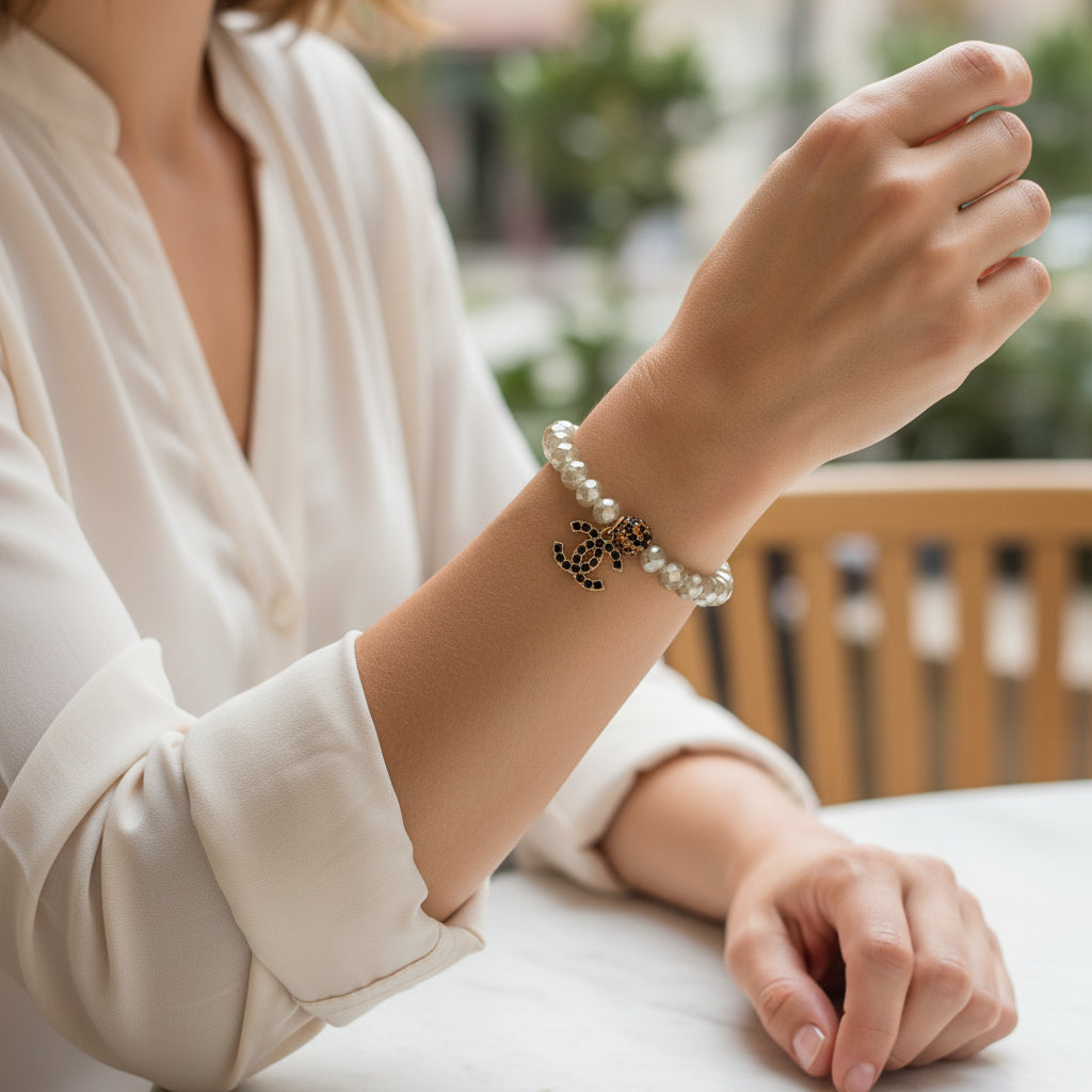 Classic, neutral, and just the right amount of glam—this champagne faceted glass bead stretch bracelet is an easy everyday staple. Finished with a statement charm and a pop of sparkle, it’s perfect worn solo for a clean, polished look or stacked with your favorite bracelets for a layered moment. Lightweight, comfy, and effortlessly chic.